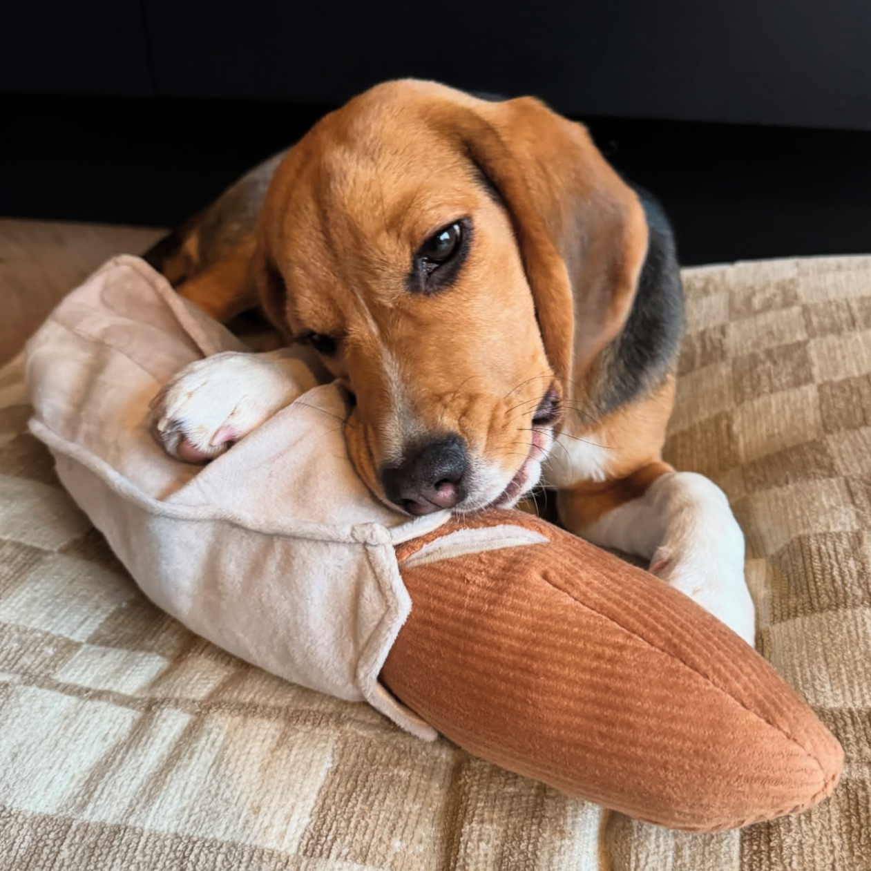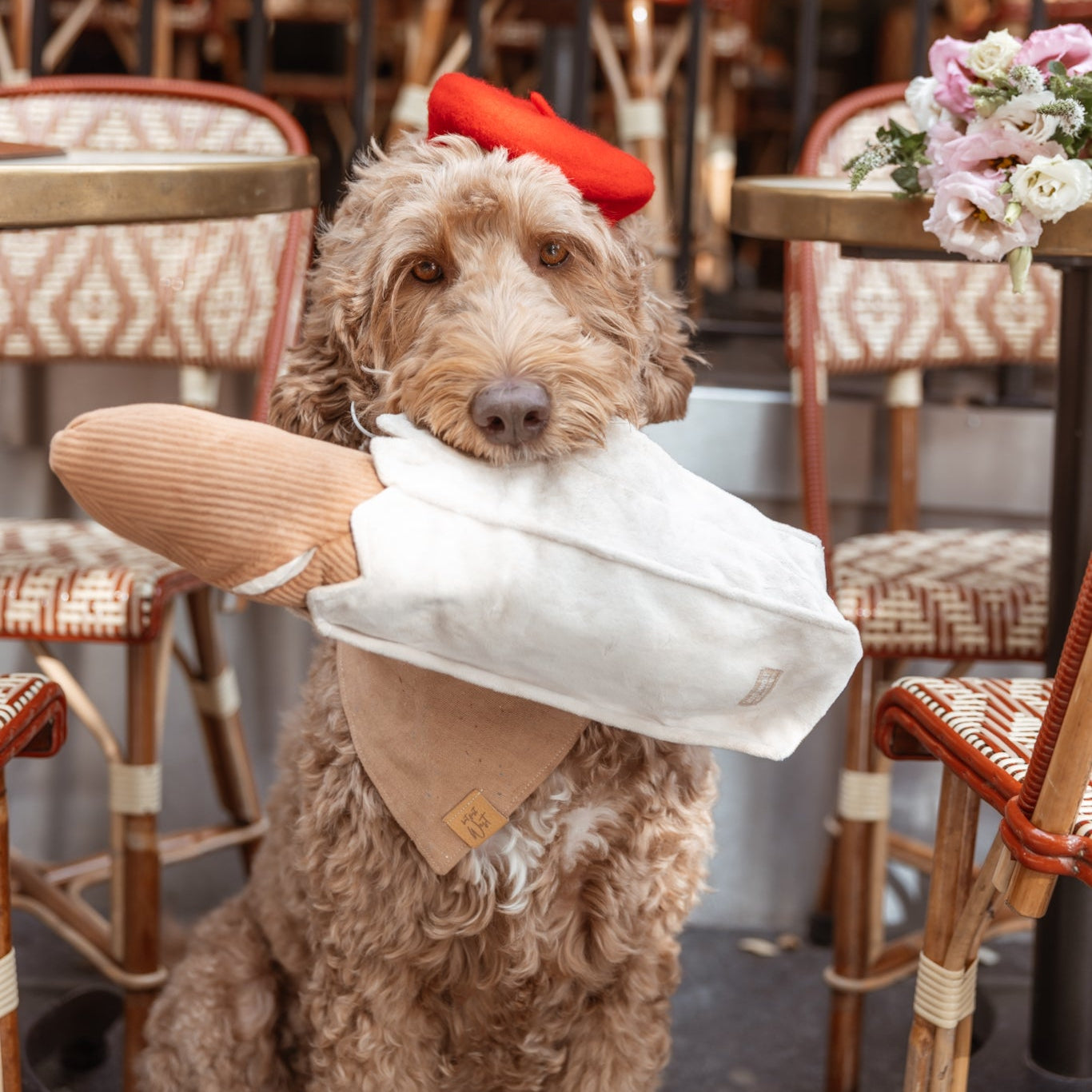 Our new BAGUETTE is an oversized enrichment play object perfect for M+ size pets. (Warning, this one will also make an exceptional headrest.) It also comes with a crinkly paper bag for you to store or hide even more treats in!