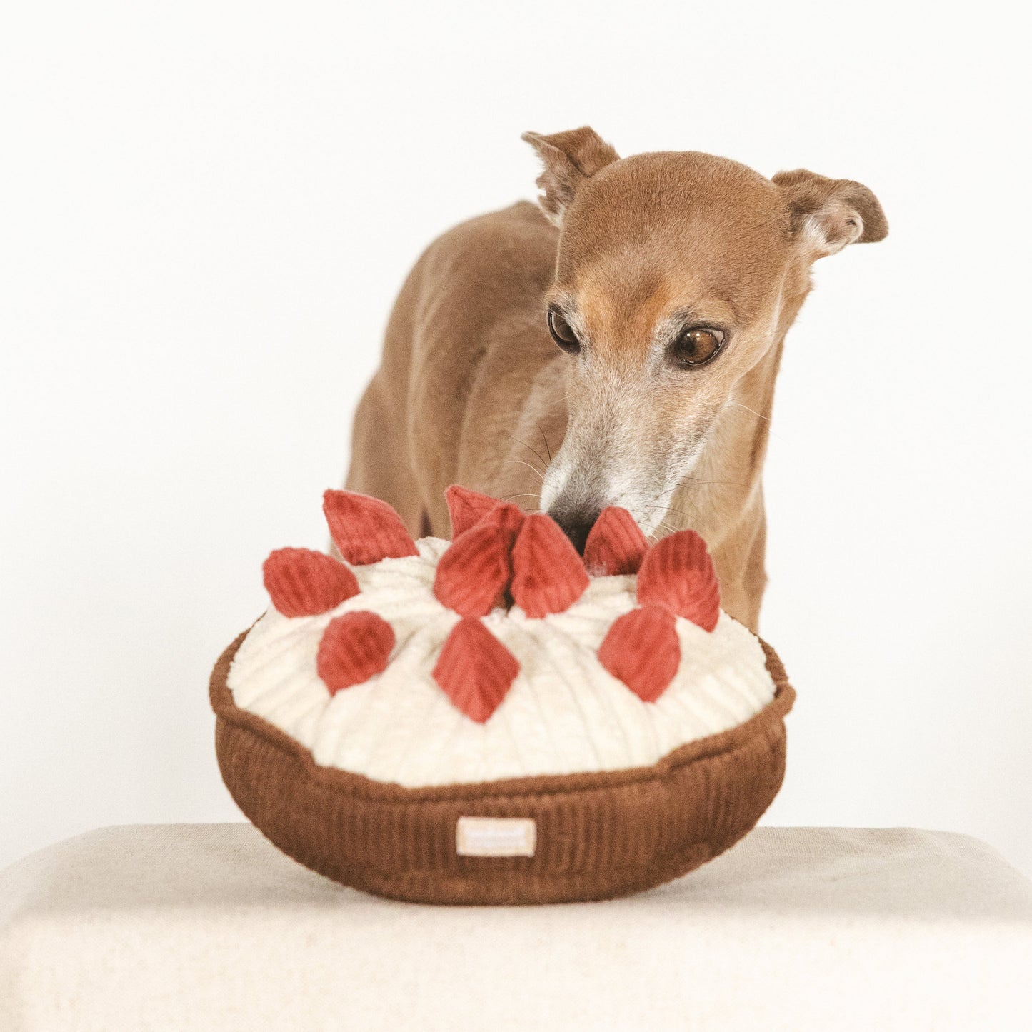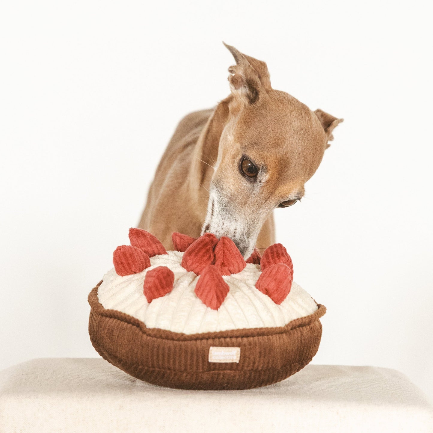 Our new BERRY PIE is a flat enrichment play object perfect for all kinds of pets, and including flat-faced breeds. Each tart features 8 pockets below each berry to hide treats and the super squeaker inside the tart adds even more fun!